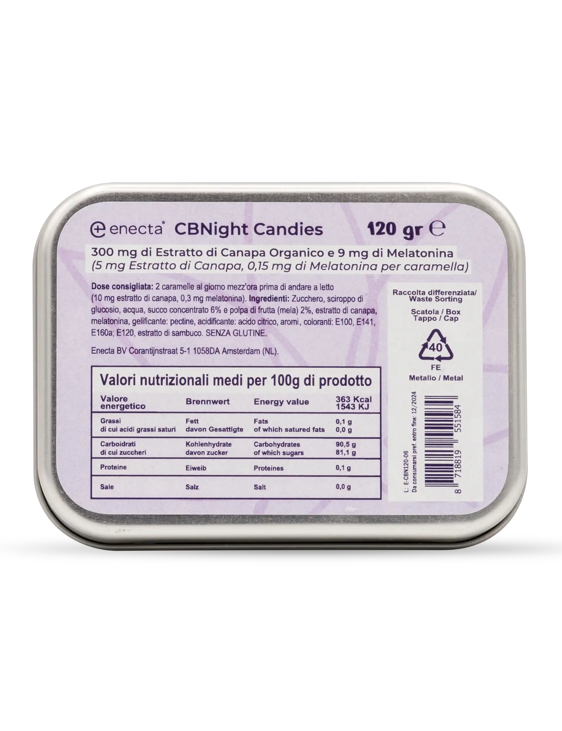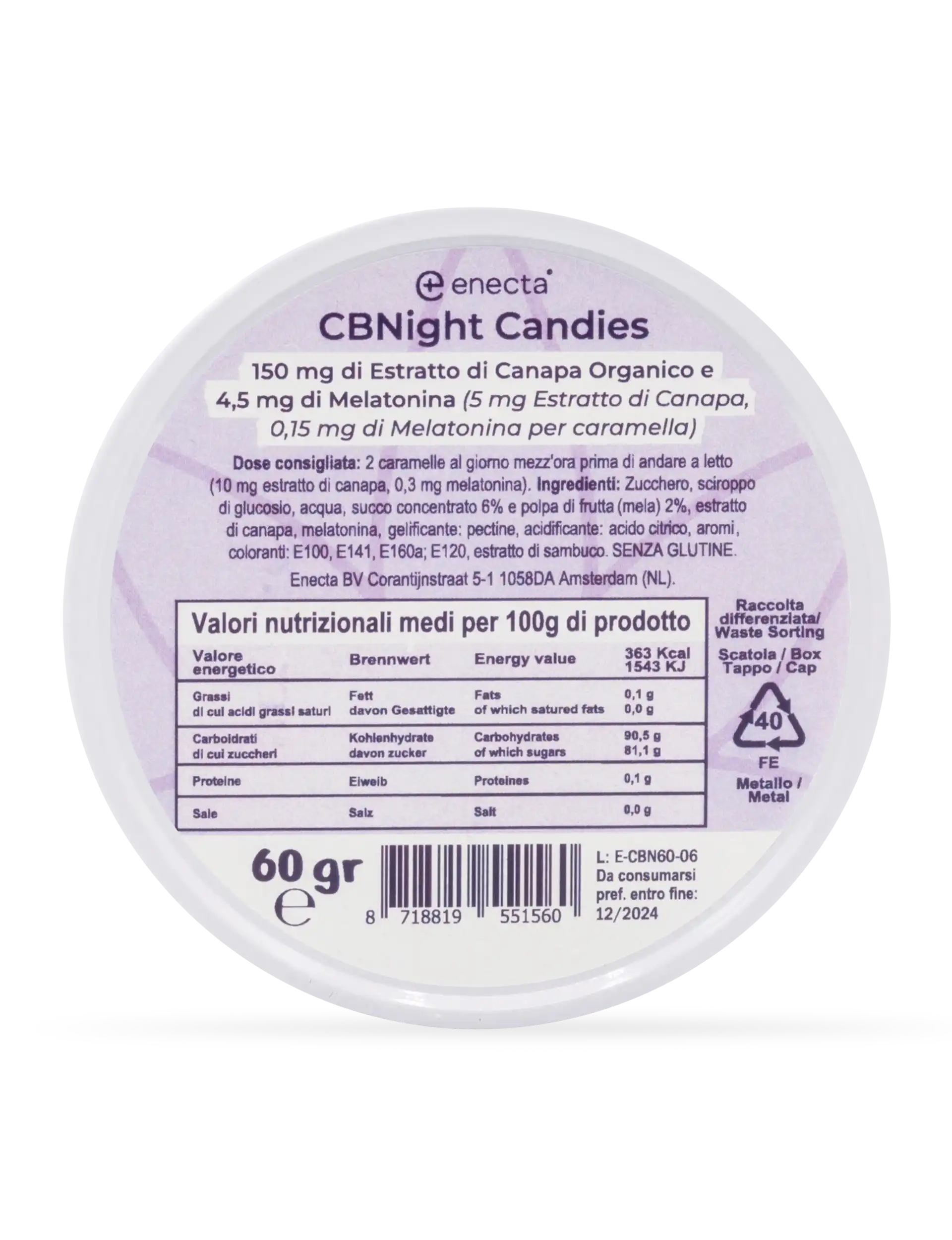 Info: Caramelle con CBD, CBN e melatonina. Vegane, naturali ed efficaci per favorire l'addormentamento e ripristinare il naturale ciclo sonno-veglia. Pratiche, discrete, comode e pre-dosate per aiutare con l'insonnia e i disturbi del sonno.