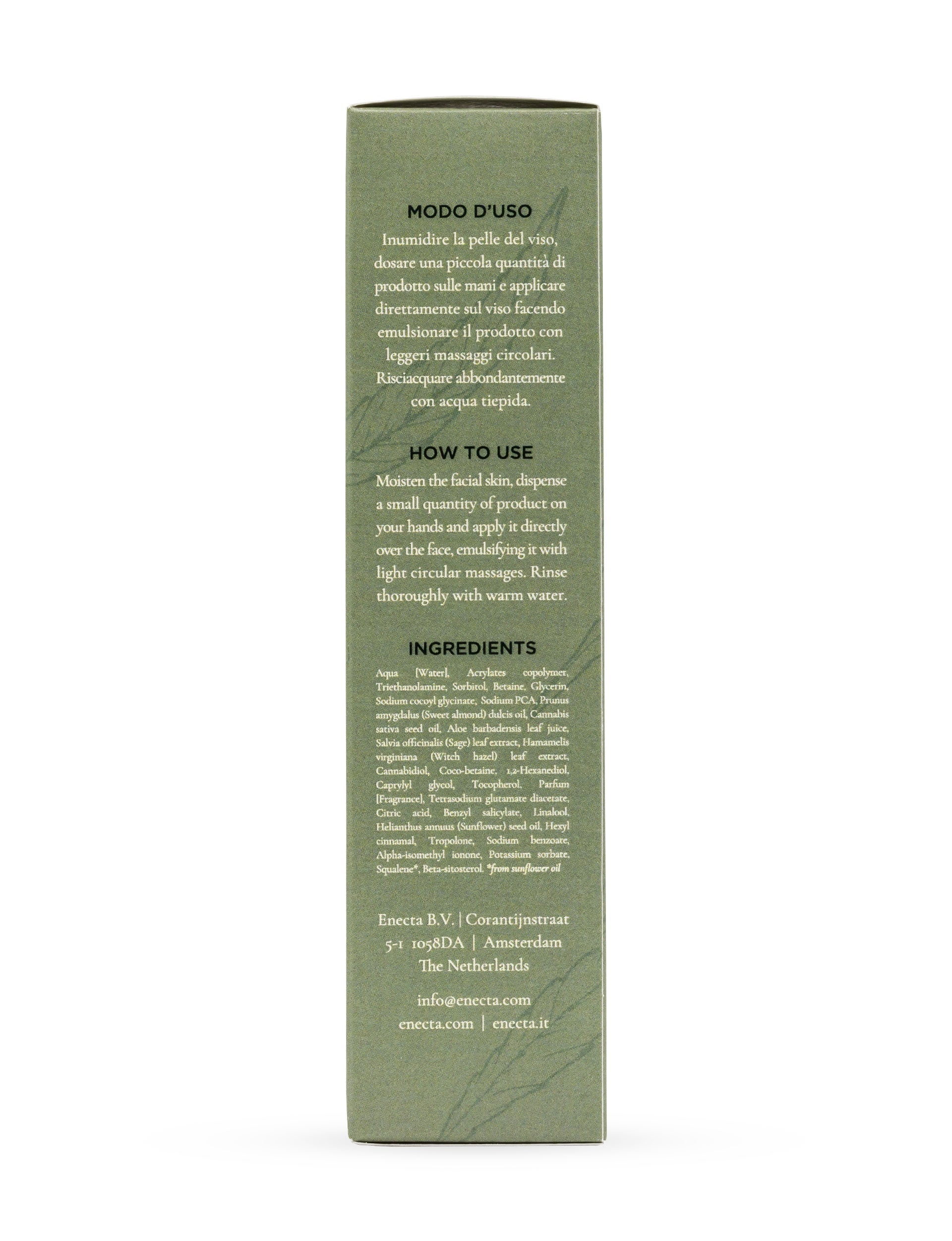 Info: Un cosmetico detergente al CBD che elimina le impurità rispettando il pH della pelle. Deterge delicatamente tutti i tipi di pelle, anche quelle sensibili e acneiche. Arricchito con olio di semi di canapa spremuto a freddo, agisce anche come seboregolatore.